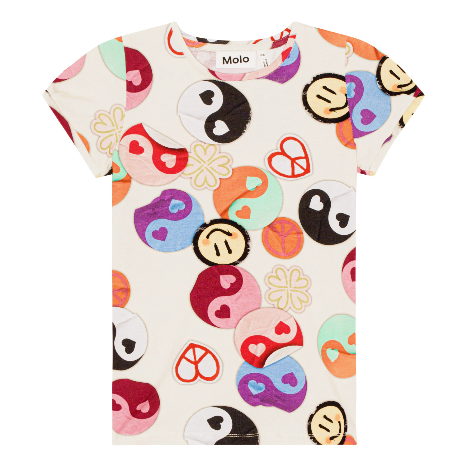 White t-shirt in organic cotton with a multi-coloured, all over yin/yang sticker print. The t-shirt has a round neck, short puff sleeves and is in a snug fit.