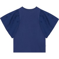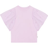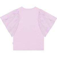 Pastel purple top in organic cotton with short, broderie anglaise sleeves. The sleeves are gathered at the top to create an elegant puff effect.