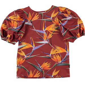 Rivera is a dark red top with a print of exotic orange flowers. The top has puff sleeves and an elastic edge at the sleeves cuffs so the sleeves sit perfectly.