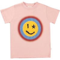 Road is a pink t-shirt with a print of one smiley face on the front.