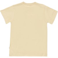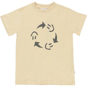 Road is a light yellow t-shirt with a print of smiley faces going in circles.