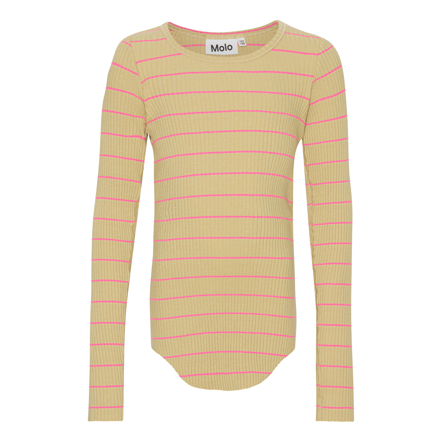 Rochelle is a rib top with long sleeves. It has a slightly longer hem in the front and back as well as raw edges at the sleeves and bottom. The top is in fun and cool pink stripes on a dusty yellow background. Rochelle has a slim fit that makes it perfect to wear alone or under another style.