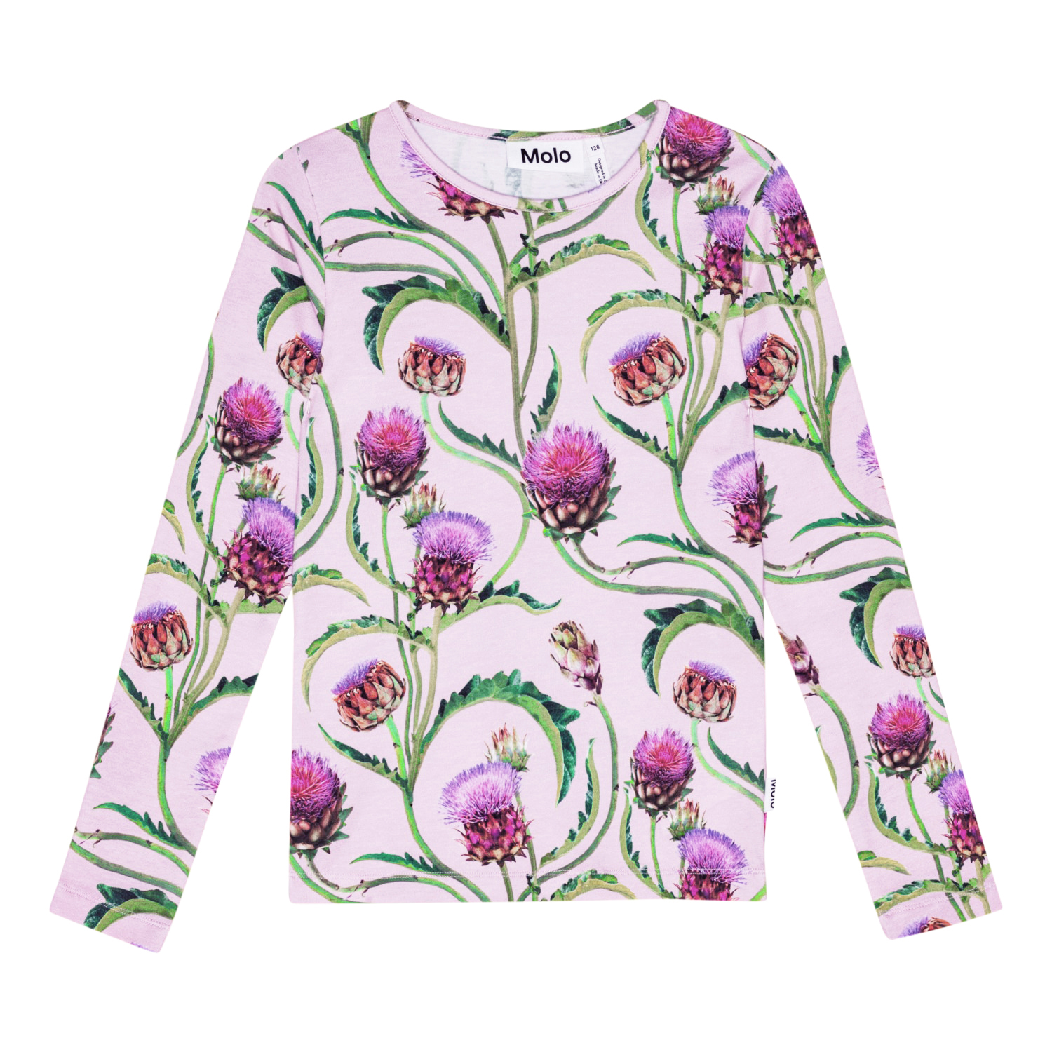 Long sleeve, purple top in organic cotton.. It's in a snug fit and has a round neck. The top has a multi-coloured, all over print of artichokes in shades of red, purple and green.
