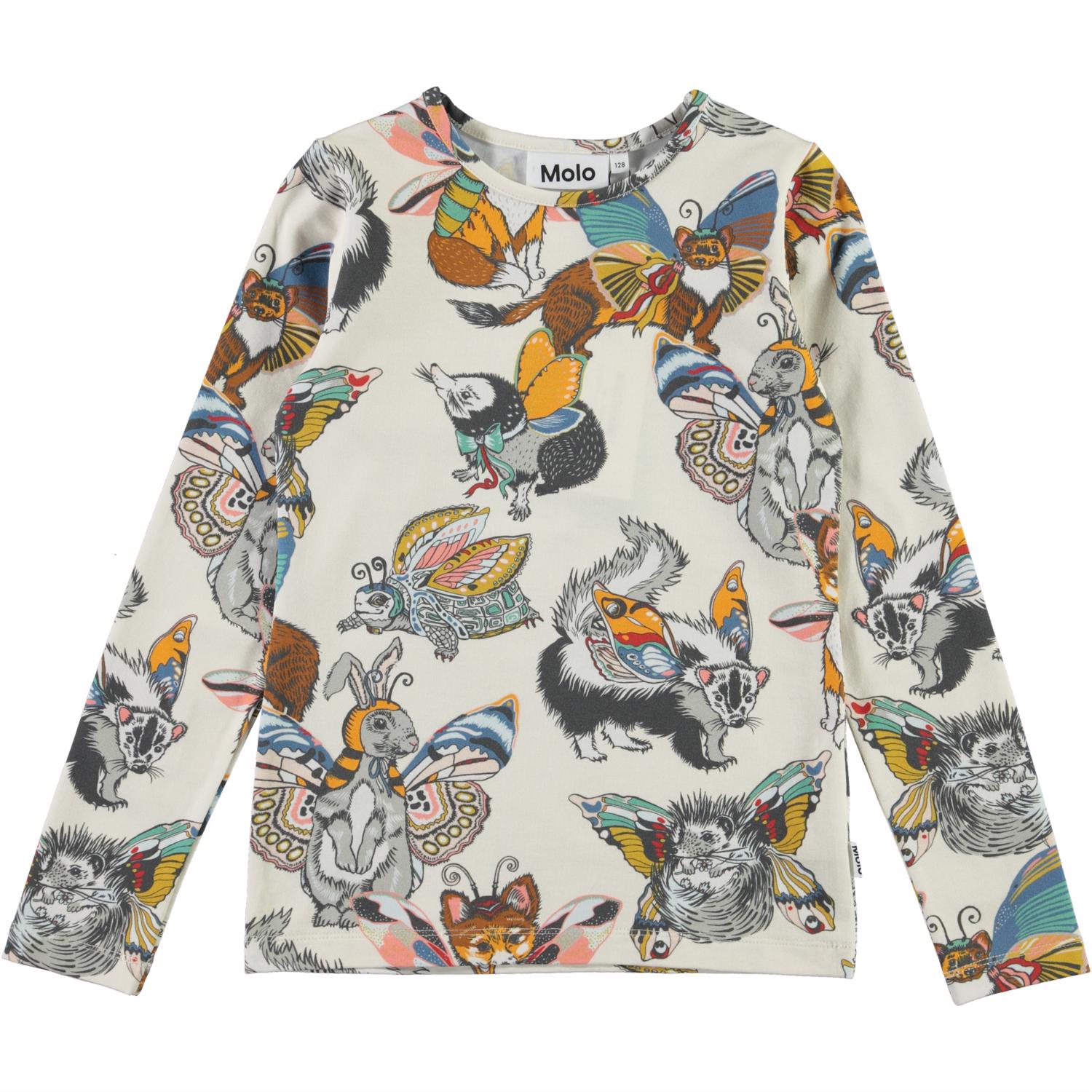 Rose is a long sleeve, light coloured top with an all-over print of forest animals with wings. Can you identify the animals, even with wings? The top has a round neck.