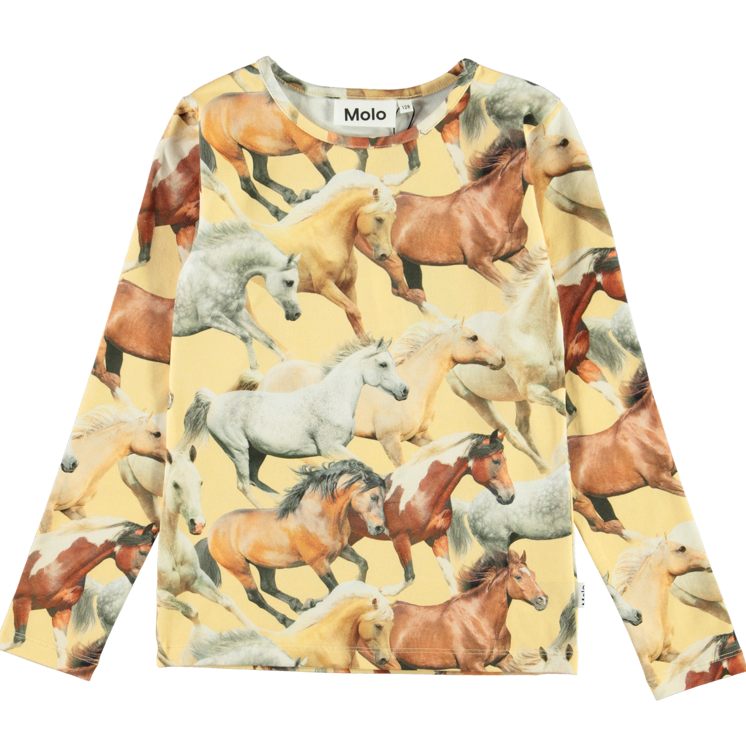 Rose is a long sleeve top in yellow with a horse print. Rose has a round neck.
