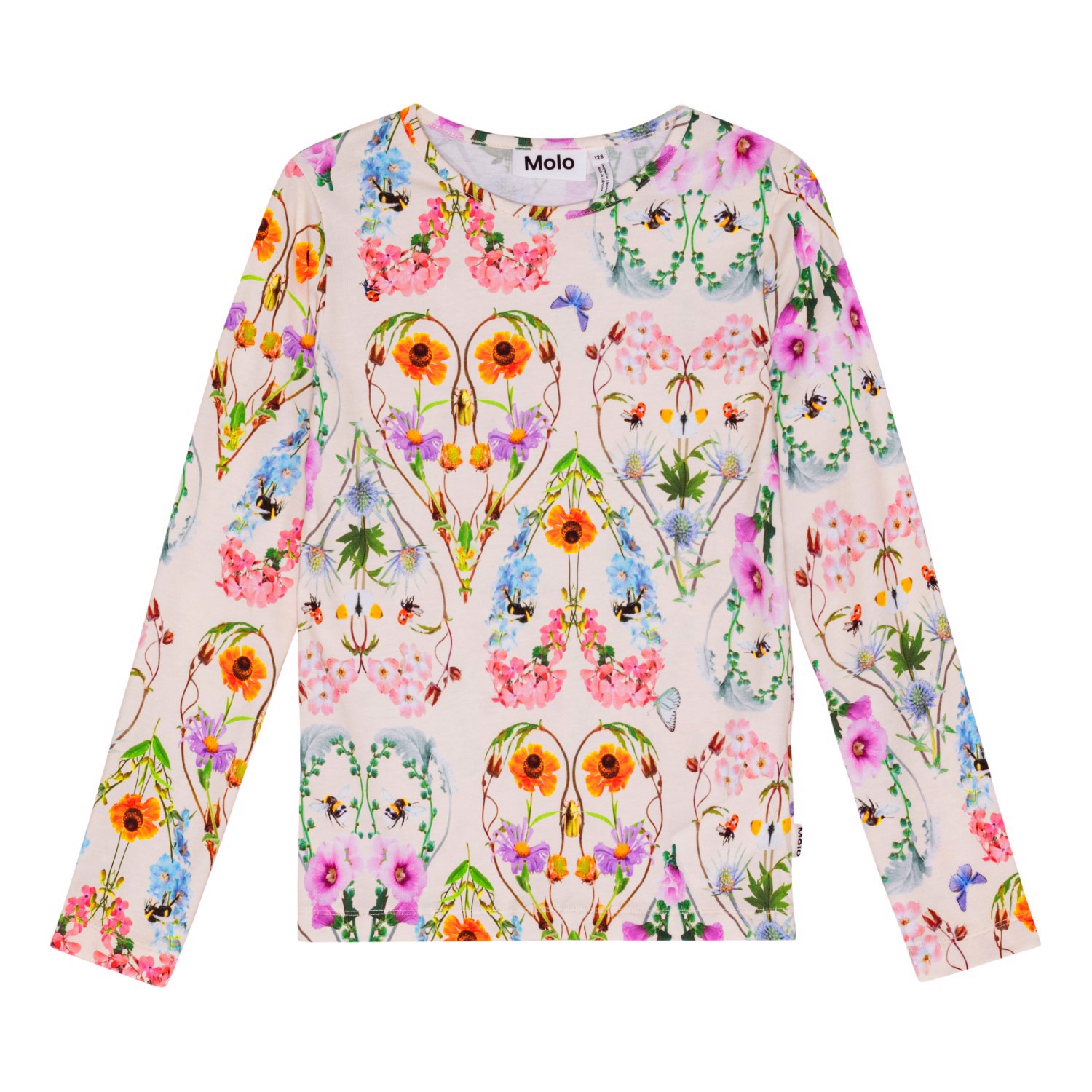 Lightweight, long sleeve top in organic cotton. It's in a snug fit and has a round neck. The top has a multi-coloured, all over print of insects and wild, colourful flowers that form hearts.