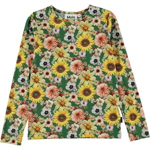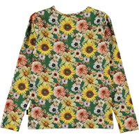 Green, long sleeve top in an all over floral print. The print is of various flowers like sunflowers and Dahlias in shades of pink and yellow. This top is in 100% cotton jersey, has long sleeves, a round neck and is in a regular fit.