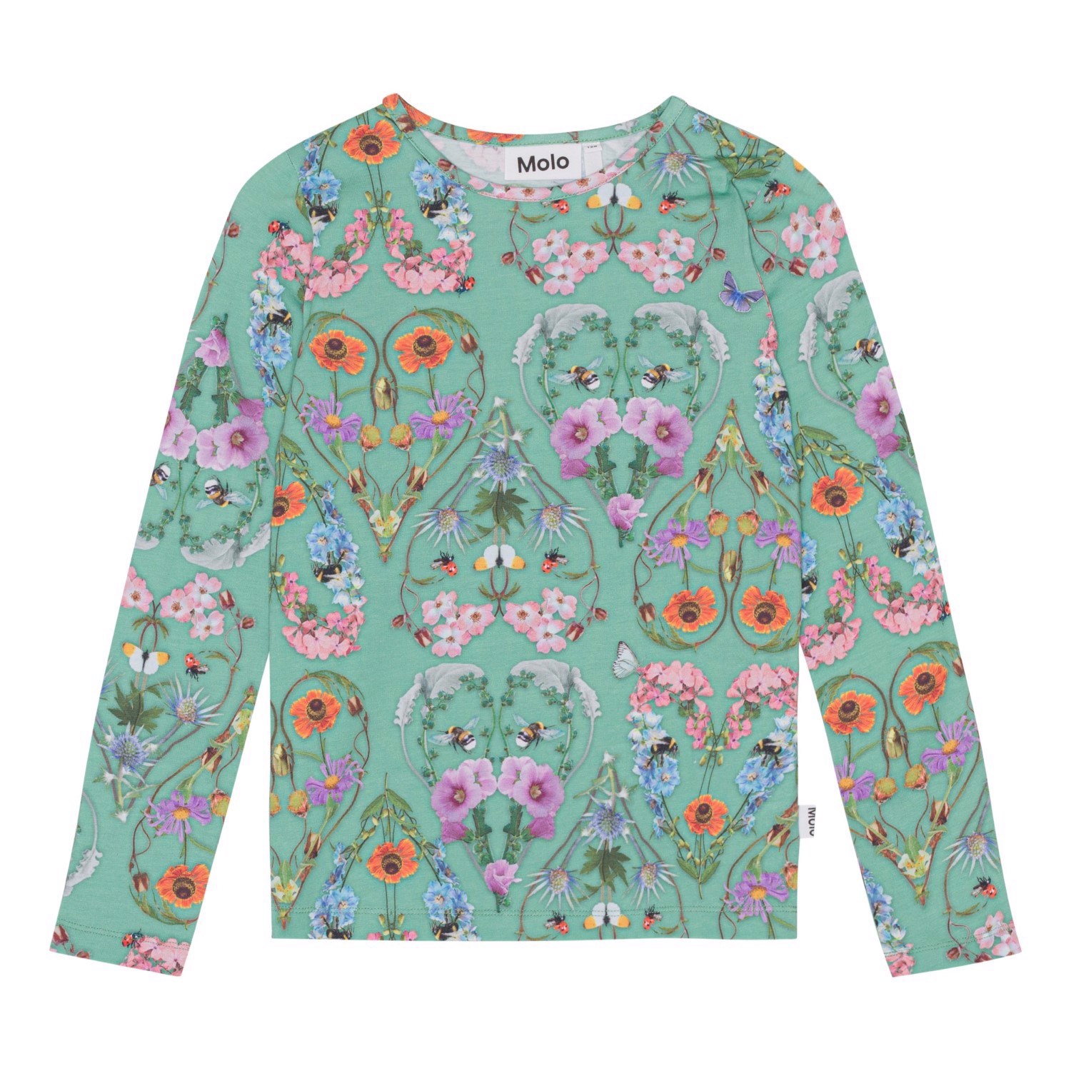 Long sleeve, green top in organic cotton. It's in a snug fit and has a round neck. The top has a multi-coloured, all over print of insects and wild, multi-coloured flowers that form hearts.