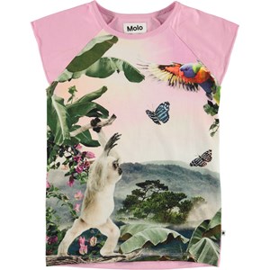 The Rosetta t-shirt shows a haze that's drifting over the Amazon, with birds and butterflies flying above the head of a monkey. Rosetta is a light purple, cotton t-shirt with short sleeves.