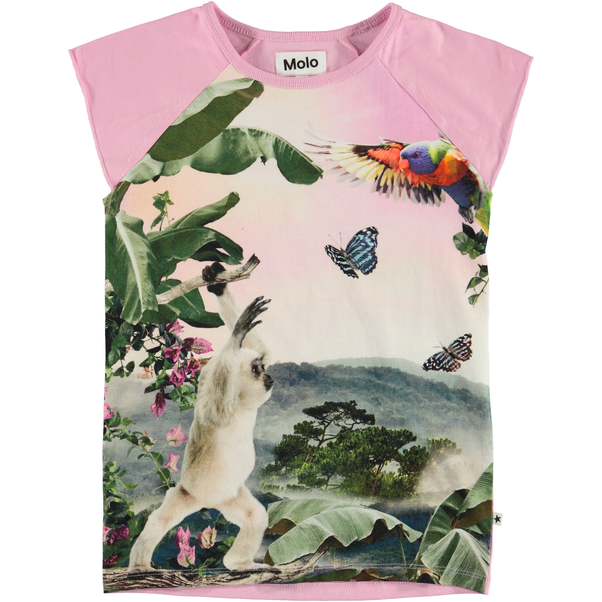 The Rosetta t-shirt shows a haze that's drifting over the Amazon, with birds and butterflies flying above the head of a monkey. Rosetta is a light purple, cotton t-shirt with short sleeves.