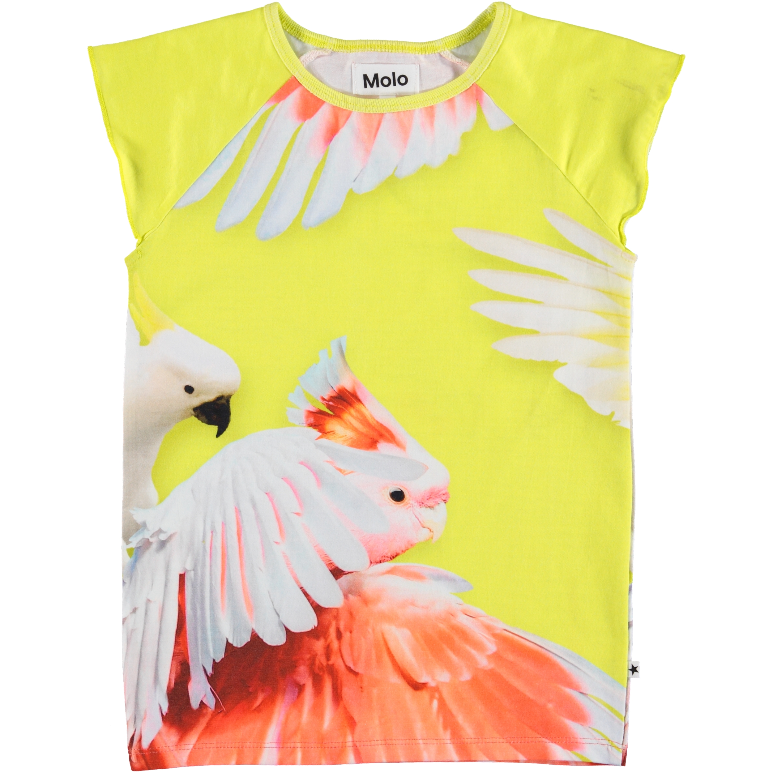 Rosetta is a yellow t-shirt with short sleeves and a parrot print.