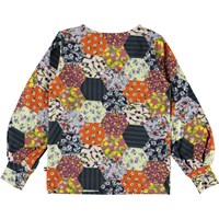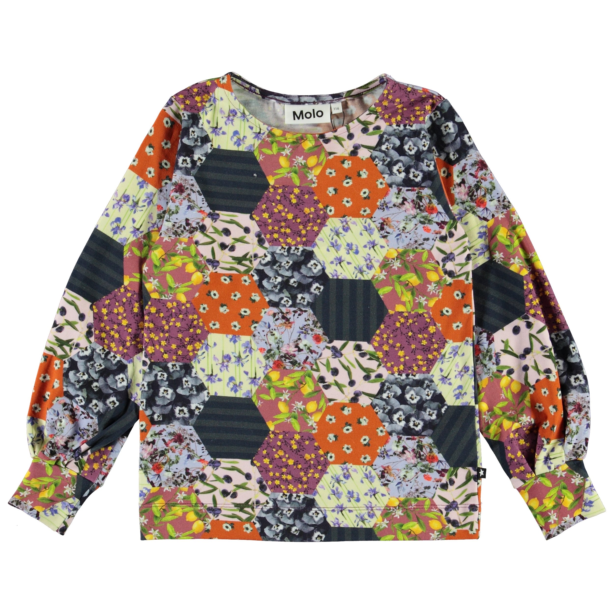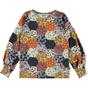 Rylee is a long sleeve top with puff sleeves in Molo's new 'Patchwork' print, which has both flowers and lemons.