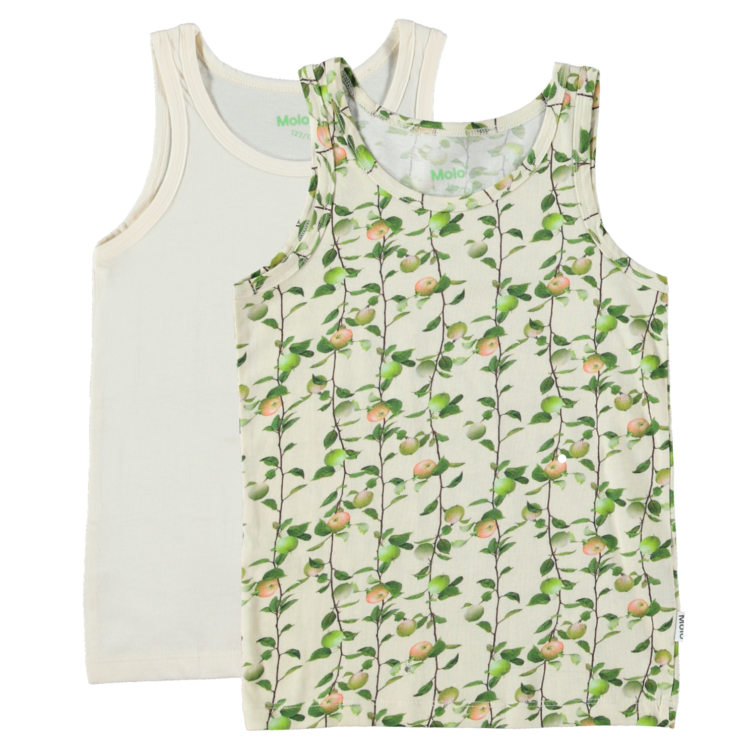 2-pack of vests with wide straps. One is in cream, and the other is in a print of branches of apples.