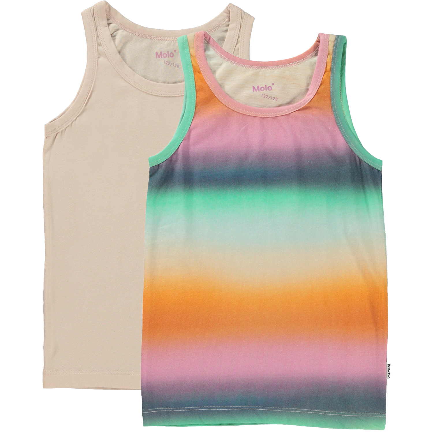 2-pack of vests with wide straps. One is in pink, while the other is in a faded multi-coloured print.