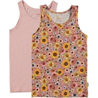 2-pack vests. This version of our popular 2-pack includes a pink vest and a vest in a floral print that is a lot of different flowers like sunflowers and Dahlias in shades of pink and yellow. This 2-pack is in 100% cotton jersey and has wide straps. The soft cotton has stretch that ensures comfortable, unrestricted movement. Wear this 2-pack with our Jemma 2-pack that are the matching knickers.