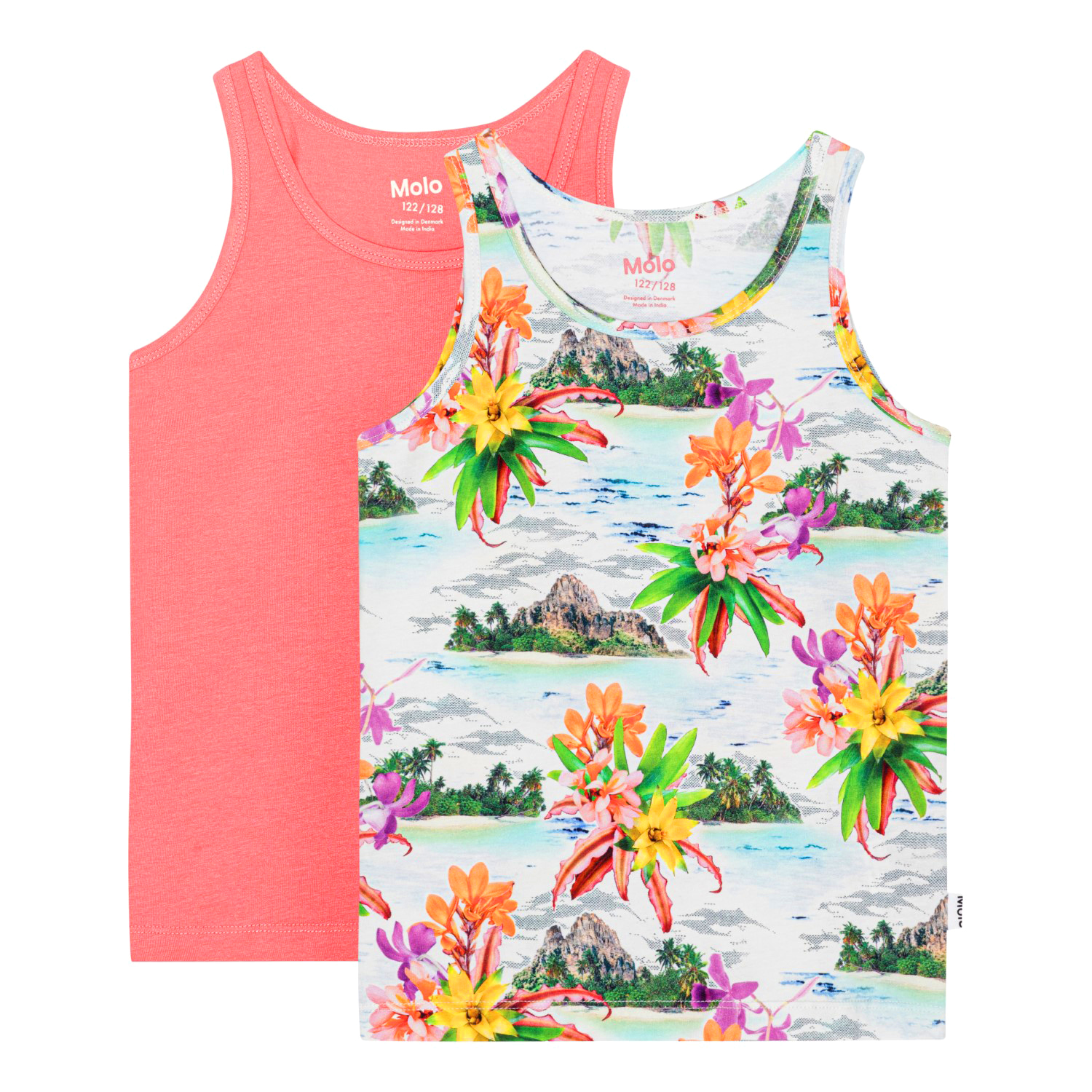 2-pack tops in soft, organic cotton. The tops have wide straps and the soft, stretchy cotton makes them extremely comfortable. One top is in an all over print of desert islands and Hawaiian flowers. The other top is in a fresh coral colour. Wear the vests with the matching knickers for a complete set.