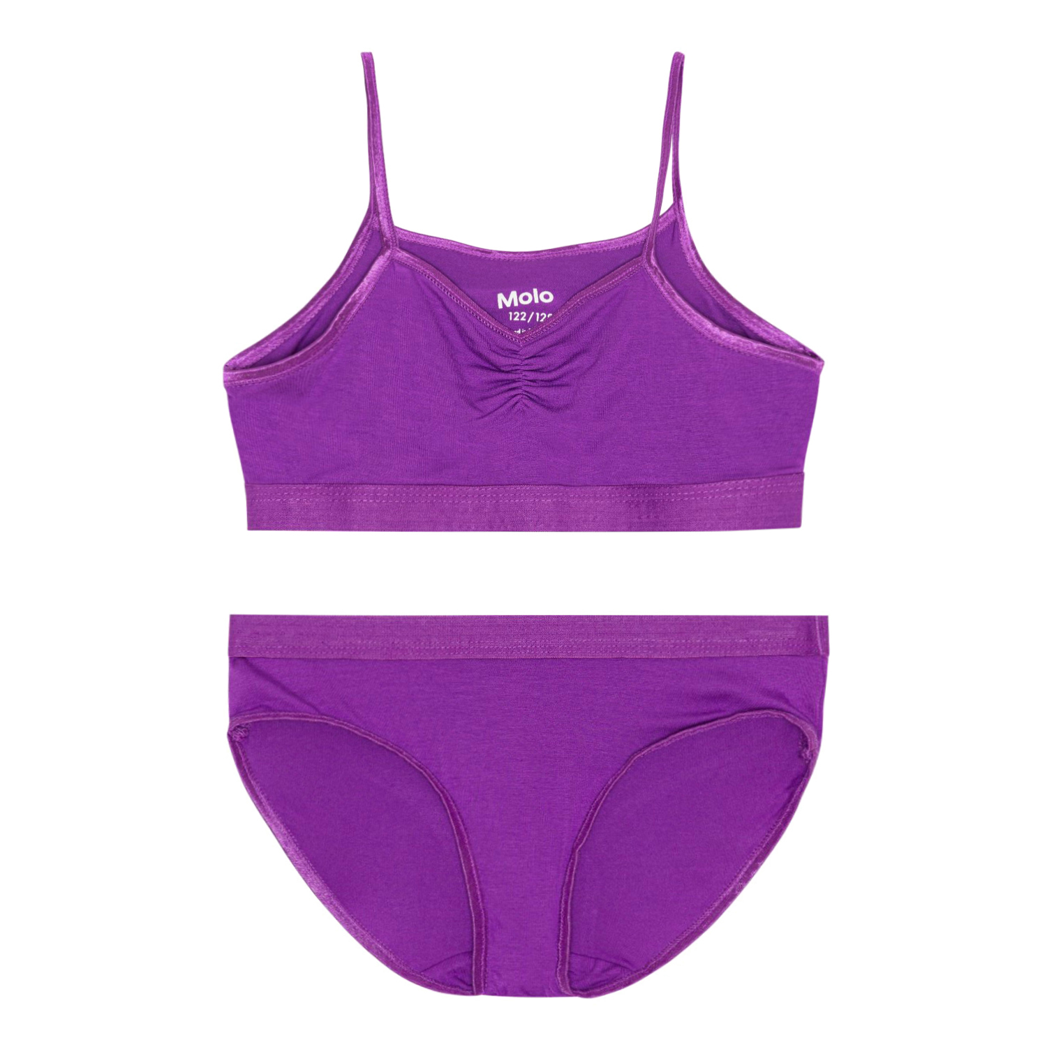 Soft, purple, stretchy underwear set. The top has thin, elastic straps and a delicate gathered detail at the centre front to create a feminine shape. The top and bottoms have a wide elastic to ensure a good, comfortable fit.