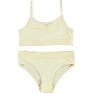 Jinny is a light yellow underwear set. Both the top and the bottoms have a wide, black elastic edge to ensure a good fit.