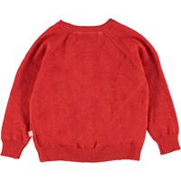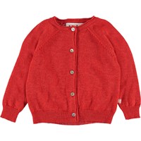 Gladys is a red baby cardigan in a delicate knit. Gladys has mother of pearl buttons and rib at the neck, sleeves and bottom.