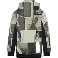 Cloudy is a sporty and waterproof softshell jacket in beige with a print af snowboarders. Cloudy has a detachable hood, a front zip closure, pockets at the sides and snow flaps at the sleeves. It has an elastic edge at the bottom. Molo's softshell jackets are the perfect choice for transitional weather because the outer fabric is windproof, waterproof and breathable while the inner fleece is recycled. This product has a water resistant, PFC-free surface treatment (Does not contain, e.g. PFOS, PFOA, etc). Water column pressure: 8.000 mm. breathable: 5.000 g/m2/24hr.