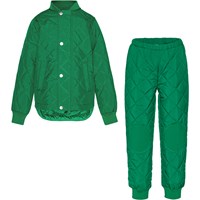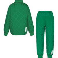 Green, quilted thermal set in polyester. The jacket has has side pockets, rib edge at the neck and wrists and a hidden front zip closure that has a wind placket with practical snaps. The trousers have a rib edge at the legs and an adjustable elastic waist. Thermal outerwear is ideal for transition periods, where winter outerwear is too warm but a summer jacket is too cold. Thermal outerwear is breathable and insulated without sacrificing movement and comfort. In the autumn and winter months, use thermal outerwear under rainwear as an extra layer of insulation.