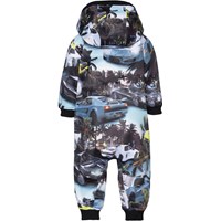 Hill is a softshell baby romper with a print of fast cars and palm trees. Hill is roomy and has a slanted pink zipper, a detachable hood and rib at the neck, hood edge, sleeves and bottom. The romper is perfect for transitional periods because the fabric is windproof, waterproof and breathable. This product has a water resistant, PFC-free surface treatment (Does not contain, e.g. PFOS, PFOA, etc). Water column pressure: 8.000 mm. breathable: 3.000 g/m2/24hr.