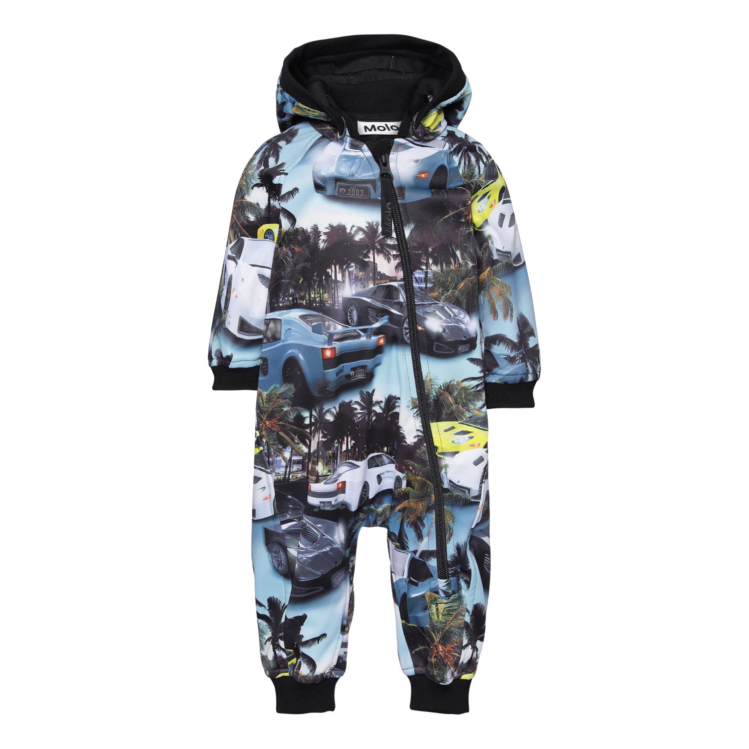 Hill is a softshell baby romper with a print of fast cars and palm trees. Hill is roomy and has a slanted pink zipper, a detachable hood and rib at the neck, hood edge, sleeves and bottom. The romper is perfect for transitional periods because the fabric is windproof, waterproof and breathable. This product has a water resistant, PFC-free surface treatment (Does not contain, e.g. PFOS, PFOA, etc). Water column pressure: 8.000 mm. breathable: 3.000 g/m2/24hr.