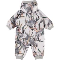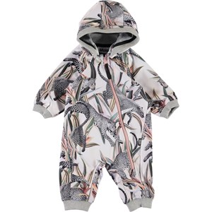 Hill is a baby softshell romper in a light colour with a print of leopards. Hill is roomy and has a slanted zipper, a detachable hood and rib at the neck, hood edge, sleeves and bottom. The romper is perfect for transitional periods because the fabric is windproof, waterproof and breathable. This product has a water resistant, PFC-free surface treatment (Does not contain, e.g. PFOS, PFOA, etc). Water column pressure: 8.000 mm. breathable: 3.000 g/m2/24hr.