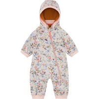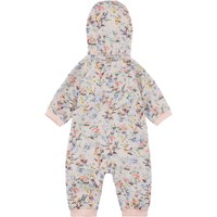 Hill is a soft, functional softshell suit for babies and small children. it is designed in a lovely floral print with a contrast colour on the inside. Hill has a detachable hood, soft rib edges, a reflector on the back and a long zip front closure for easy dressing. Molo's softshell suits are the perfect choice for creches and nursery schools because the fabric is waterproof, windproof and breathable, while the inner fabric is made from recycled polyester from plastic bottles. This product has a water resistant, PFC-free surface treatment (Does not contain, e.g. PF OS, PFOA, etc). Water column pressure: 8.000 mm. breathable: 5.000 g/m2/24hr. It does not have taped seams.