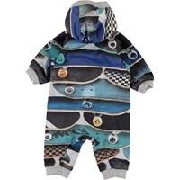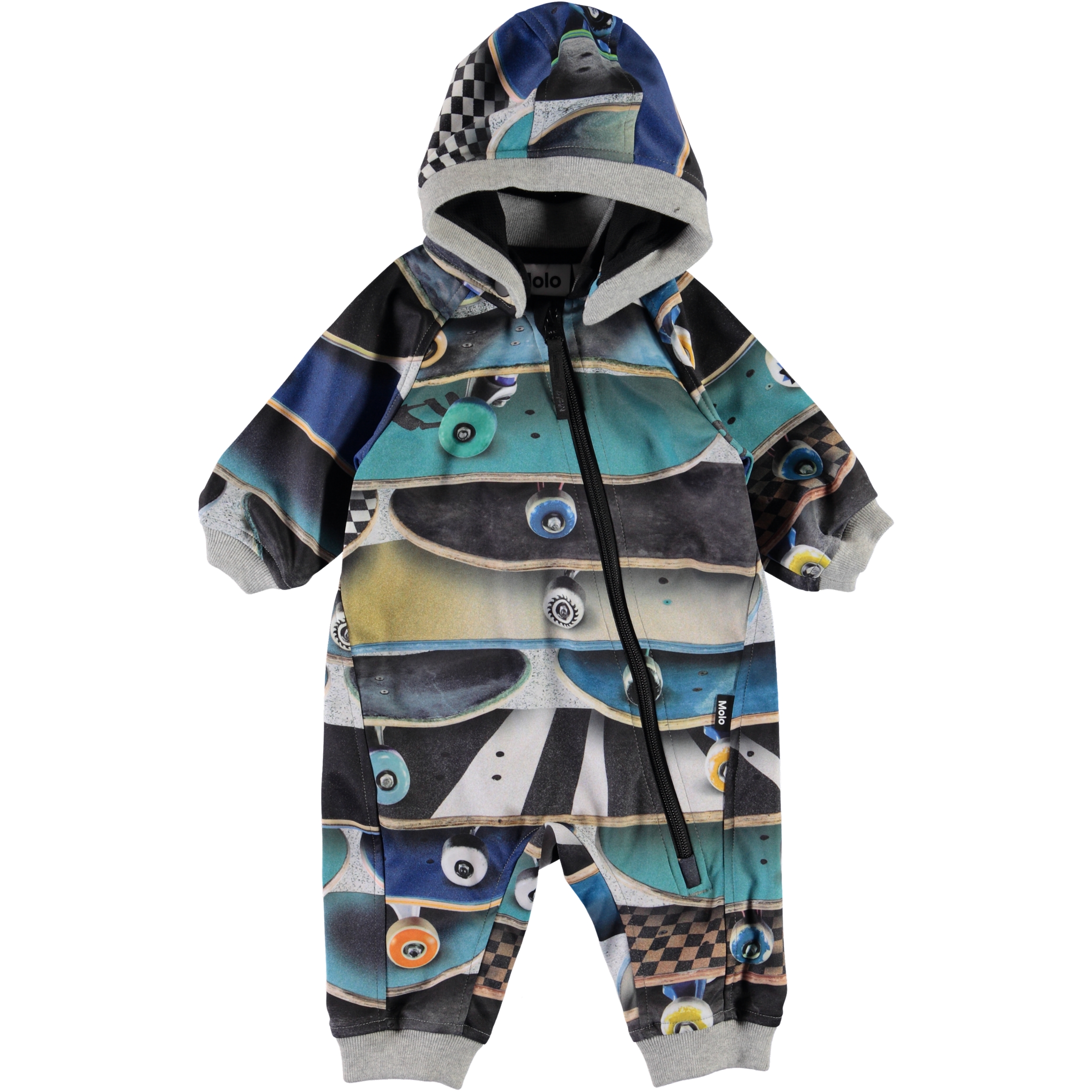 Hill is a baby softshell romper with a skateboard print. Hill is roomy and has a slanted zipper, a detachable hood and rib at the neck, hood edge, sleeves and bottom. The romper is perfect for transitional periods because the fabric is windproof, waterproof and breathable. This product has a water resistant, PFC-free surface treatment (Does not contain, e.g. PFOS, PFOA, etc). Water column pressure: 8.000 mm. breathable: 3.000 g/m2/24hr.