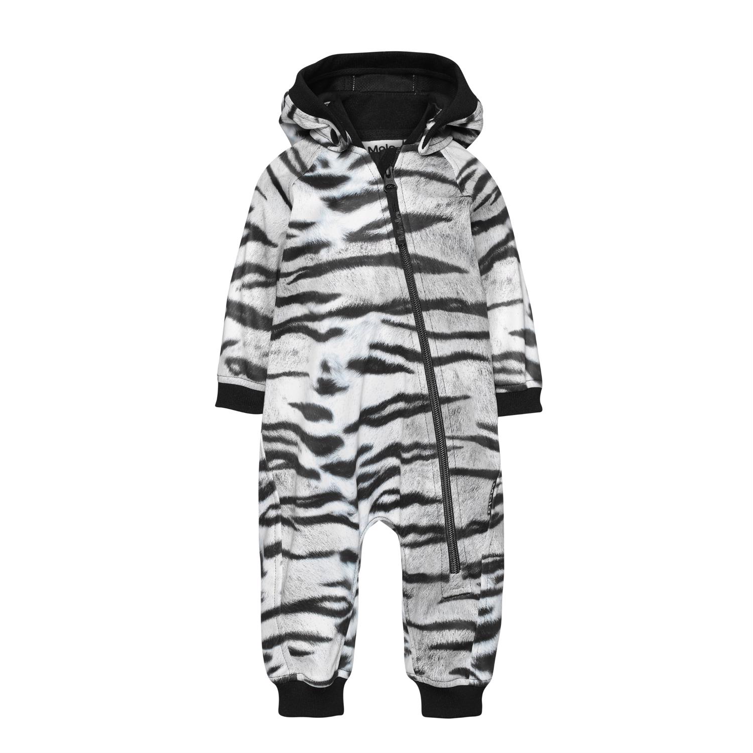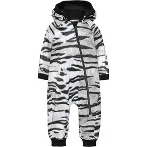 Hill is a softshell baby romper with a white and black tiger print. Hill is roomy and has a slanted pink zipper, a detachable hood and rib at the neck, hood edge, sleeves and bottom. The romper is perfect for transitional periods because the fabric is windproof, waterproof and breathable. This product has a water resistant, PFC-free surface treatment (Does not contain, e.g. PFOS, PFOA, etc). Water column pressure: 8.000 mm. breathable: 3.000 g/m2/24hr.