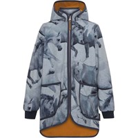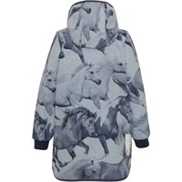 Hillary is a functional softshell jacket with a print of galloping horses and a beautiful contrast colour on the inside. The jacket is in a practical length with elastic at the back to give it a great fit. It has a detachable hood, a front zip, front pockets, rib at the sleeves and a reflector on the back. Molo's softshell jackets are perfect for transitional weather because the fabric is waterproof, windproof and breathable. The jacket has a comfortable fleece on the inside that is made from recycled plastic bottles. This product has a water resistant, PFC-free surface treatment (Does not contain, e.g. PF OS, PFOA, etc). Water column pressure: 8.000 mm. breathable: 5.000 g/m2/24hr. It does not have taped seams.