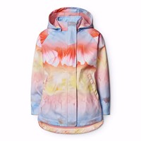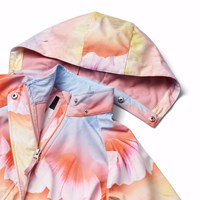 Wind and water-resistant softshell jacket in recycled polyester with a colourful print of beautiful faded petals. The jacket features a detachable hood, side pockets with snap buttons, a wind flap over the zipper, and ribbed cuffs at the sleeves, collar, and hem to effectively keep out the wind. Inside, there is a soft fleece lining and elastic at the waist for adjusting the jacket's silhouette and fit.