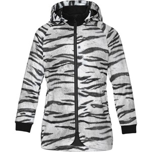 Hillary is a parka-inspired softshell jacket in a white and black tiger print. The jacket has an elastic waist, detachable hood, a front zip and an elastic edge at the sleeves. It has Molo's iconic star reflector on the back. Molo's softshell jackets are perfect for transitional weather because the fabric is waterproof, windproof and breathable. This product has a water resistant, PFC-free surface treatment (Does not contain, e.g. PF OS, PFOA, etc). Water column pressure: 8.000 mm. breathable: 3.000 g/m2/24hr