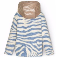 Lavender blue zebrastripe fleece jacket with a front zipper, pink hood, and large front pockets. The fleece jacket is good insulated and can be worn on its own or as an extra layer under outerwear on the coldest days.