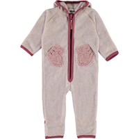 Udo is a baby fleece romper in light rose with dark rose edges and knit pockets that look like small mittens. The romper has a zip closure and a hood. Molo's fleece rompers are warm and insulating. Wear it alone or, on very cold days, as an extra layer under a snowsuit. This style will be with feet from size 56-74. Without feet from size 80-92.