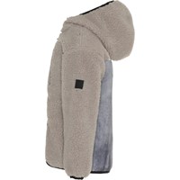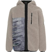 Ugo is a beige fleece jacket with a skateboard print on one side and a hood. The jacket has a black zip closure and a zip pocket on the front. The fleece jacket can be used alone or, on very cold days, as an extra layer under another jacket.