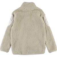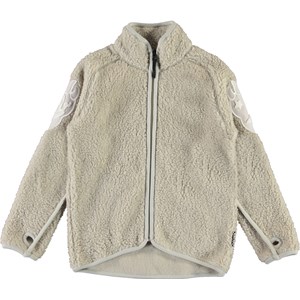 Ulan is a light coloured teddy fleece jacket with a front zip, thumb holes and a patch shaped like a bear claw on both sleeves. Molo's fleece jackets are warm and insulating. Wear it alone or, on very cold days, as an extra layer under another jacket.
