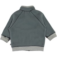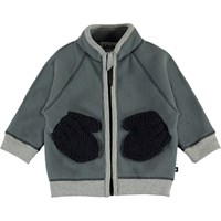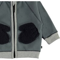 Ulf is a baby jacket in grey polar fleece with a high collar, a ruffle edge on the front and a zip closure. The fleece jacket has lovely front knit pockets that look like small mittens. Wear it alone or, on very cold days, as an extra layer under another jacket.