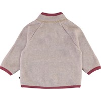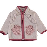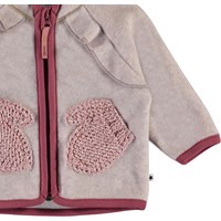 Uli is a baby jacket in a very light rose colour polar fleece. It has a high collar, a ruffle edge on the front and a zip closure. The fleece jacket has lovely front knit pockets that look like small mittens. Wear it alone or, on very cold days, as an extra layer under another jacket.