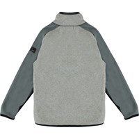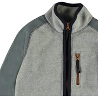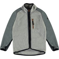 Unna is a grey coloured fleece jacket with green sleeves. It has an orange front zip and has a single chest pocket. Molo's fleece jackets are warm and insulating. Wear it alone or, on very cold days, as an extra layer under another jacket.