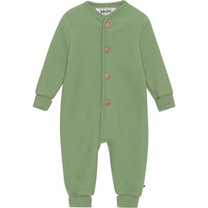 Green baby onesie in soft fleece made from 100% merino wool. The onesie is highly suitable as outerwear when going for a walk or nap in the stroller during the cold autumn and winter months. The onesie can also be used indoors when children play and tumble on the floor. It has a spacious fit with buttons along the front and snug ribbed cuffs with folded edges at the leg and arm openings.