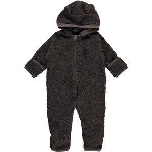 Umeko is a dark brown baby romper in fleece. It has a zip closure and a hood with sewn on ears. Molo's fleece rompers are warm and insulating. Wear it alone or, on very cold days, as an extra layer under a snowsuit.