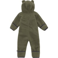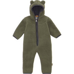 Umeko is a baby fleece romper in green. The romper has a zip closure, a hood and small sewn on ears. Molo's fleece rompers are warm and insulating. The fleece romper can be used alone or as an extra layer under a snowsuit on really cold days. Sizes 56-74 have feet while sizes 80-92 do not.