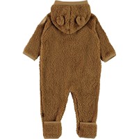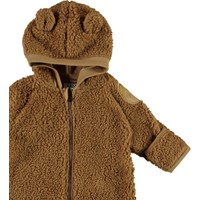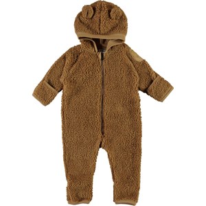 Umeko is a brown baby fleece romper. It has a zip closure and a hood with small, sewn on ears. Molo's fleece rompers are warm and keep you insulated. Wear it alone or, on very cold days, as an extra layer under another jacket.