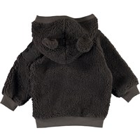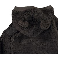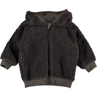 Ummi is a soft baby fleece jacket in dark brown. Ummi has a hood with sewn on ears and rib at the edge of the hood, sleeves and bottom. You can wear it as a layering piece or alone because it is warm and insulating.