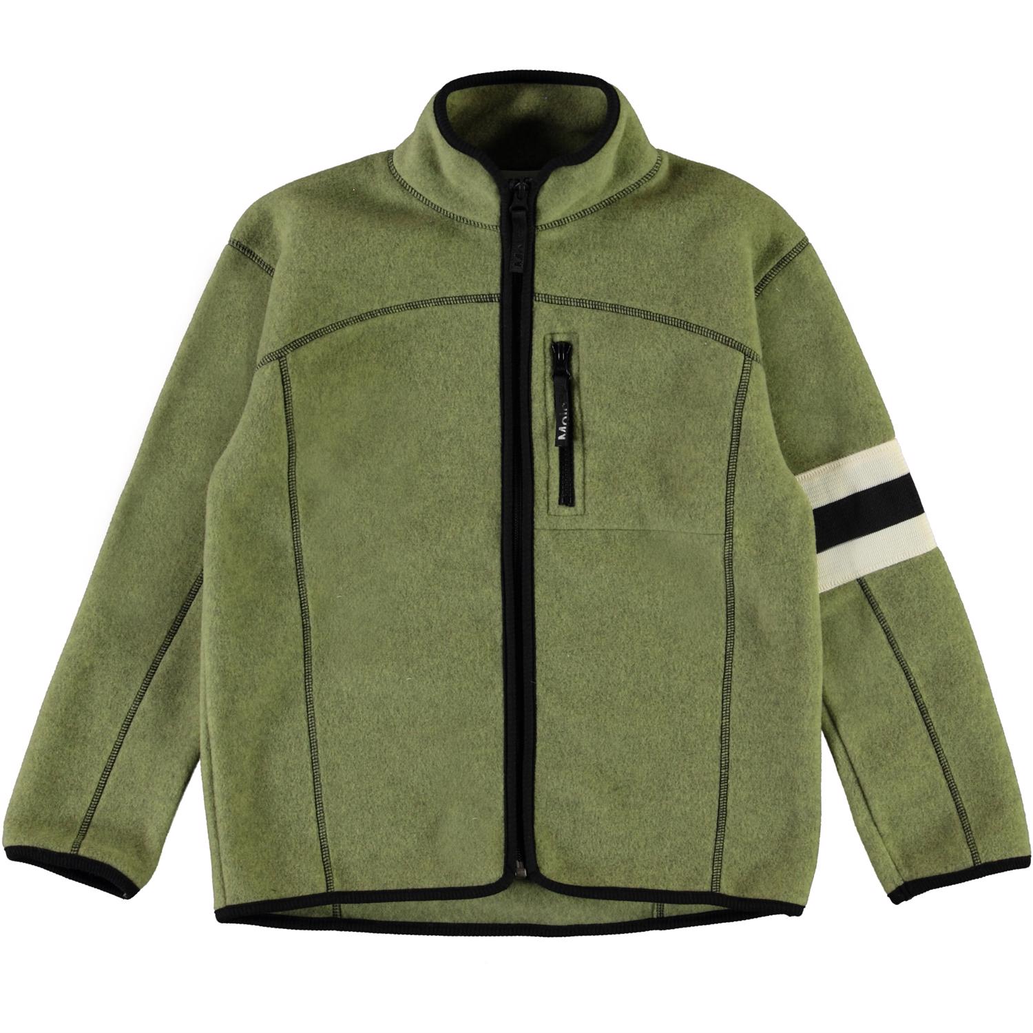 Urbano is a khaki green fleece jacket with black stitching and a zipper. It has a single chest pocket with a zip closure and a striped band down one sleeve. Molo's fleece jackets are warm and keep you insulated from the cold. Wear it alone or, on very cold days, as an extra layer under another jacket.