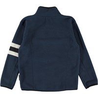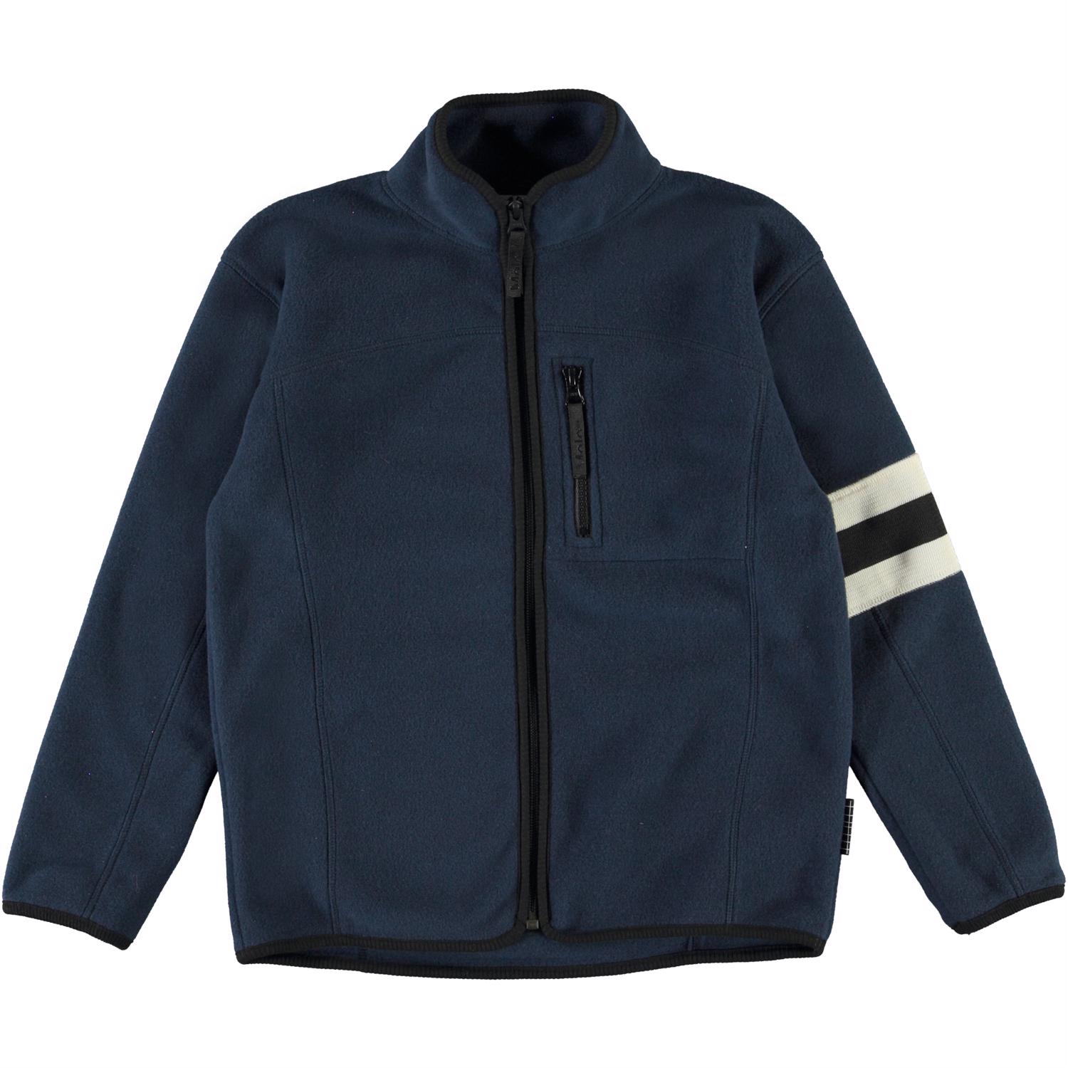Urbano is a dark blue fleece jacket with black stitching and a zipper. It has a single chest pocket with a zip closure and a striped band down one sleeve. Molo's fleece jackets are warm and keep you insulated from the cold. Wear it alone or, on very cold days, as an extra layer under another jacket.