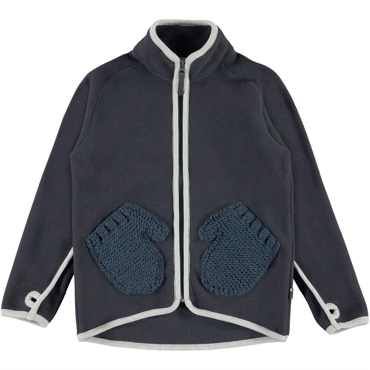 Ushi is a blue jacket in polar fleece with a high collar, a zip front closure and thumb holes. It has lovely knit front pockets that look like small mittens. Wear it alone or, on very cold days, as an extra layer under another jacket.