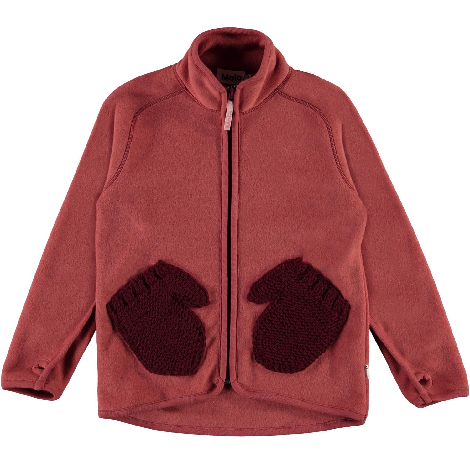 Ushi is a red jacket in polar fleece with a high collar, a zip front closure and thumb holes. It has lovely knit front pockets that look like small mittens. Wear it alone or, on very cold days, as an extra layer under another jacket.
